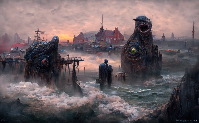 it wasn't the unnamable sea creatures that began to appear from the waters.. it was how the obelisks began to grow into the village itself. the village itself was now a creature. #innsmouth #dagon #lovecraft #hplovecraft #horrorart #aiart #generativeart #drmangor #discodiffusion