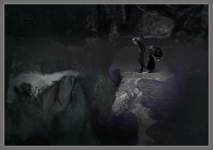ヒトやモノを描き込むと、それが基準にスケールが見えてくる。不思議。 画面いっぱいの岩の写真に手を入れた。