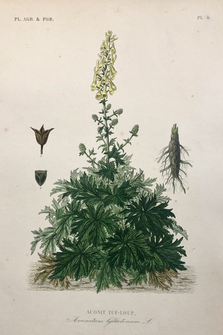 Aconitum lycoctonumの図、monkshood、wolfsbaneの呼称のトリカブト属。 全体像、特に葉の勢いを表現しているのが興味深く。 1870年出版の植物図鑑より、手彩色のエングレービング。 次回に用意します。