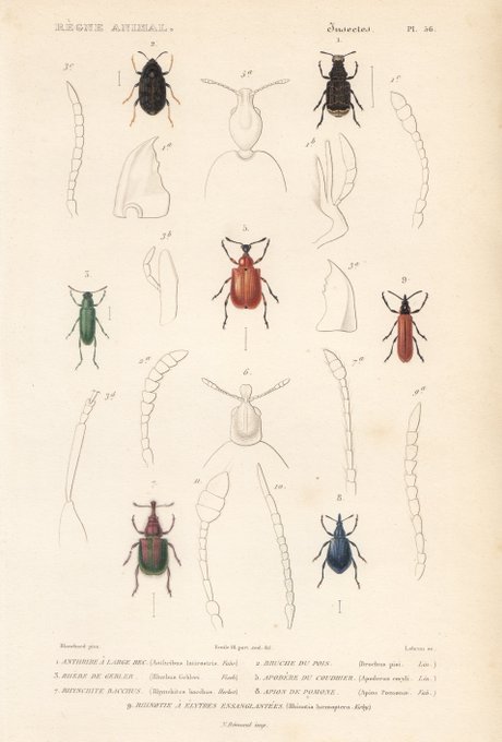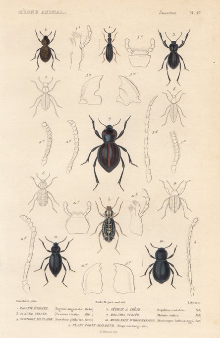 甲虫色々。 1830-40年代、フランスにて製作の手彩色点刻銅版画。