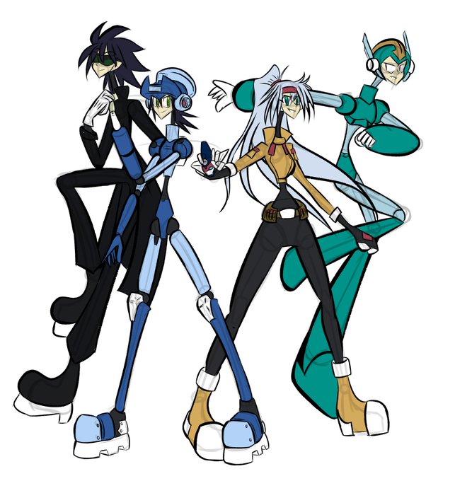 Okay so here were some characters I originally made for @PizzaStart's MegaMan 35th Anniversary art collab that I didn't finish in time for things happening at the time that I decided to finish now anyway here's Blues(Megamix), GBD(Boy, Jeff), Ashe and Rockman Volnutt.