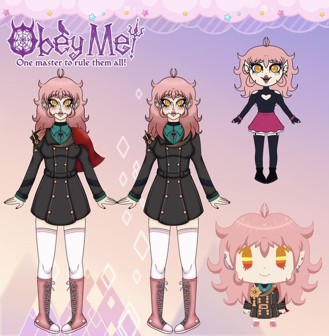 Finally posting my Obey Me Mc(?) yeah lol first part is her new design and second part is her old ones plus a demon design!!! :3 Also a very sloppy backstory sorry lol
