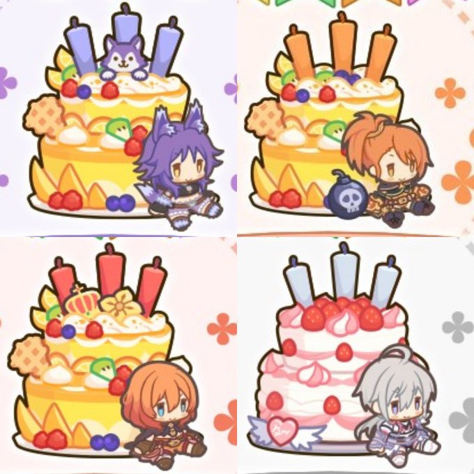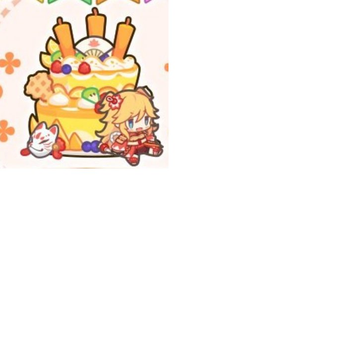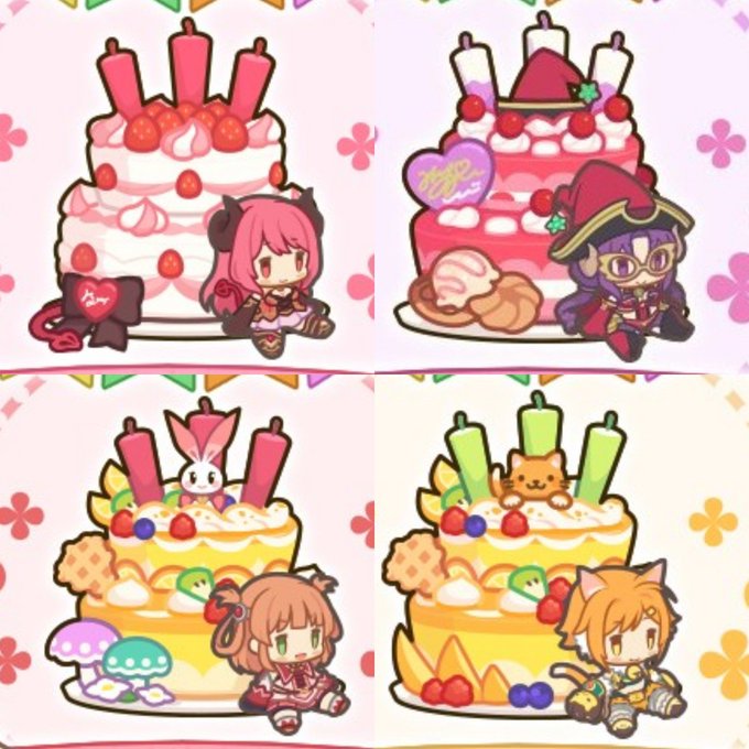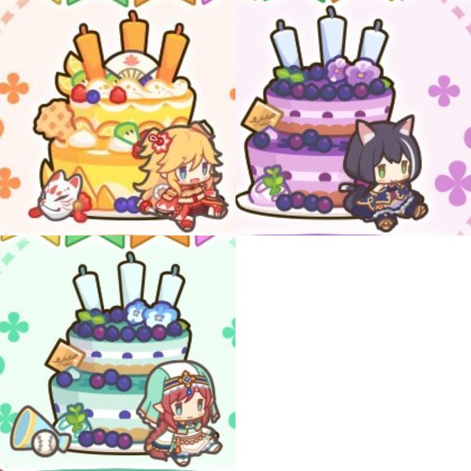 バースデーケーキ、ニノン追加。 てっぺんに扇子。下にオーエドの狐面。 #プリコネR