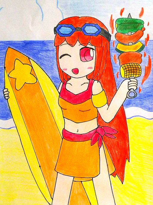 pixivにイラスト投稿しました。 今回はフラムの水着イラストバージョン2です。 細かく修正や調整をして、手に持っている小物も増やしました。 フラムは持ち前の身体能力で泳ぐことは勿論、炎を自在に操る能力でバーベキューもお手の物です。