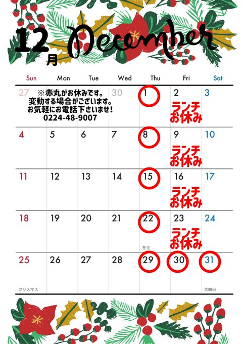 2022年12月15日㈬お休みを頂いております😌🙏