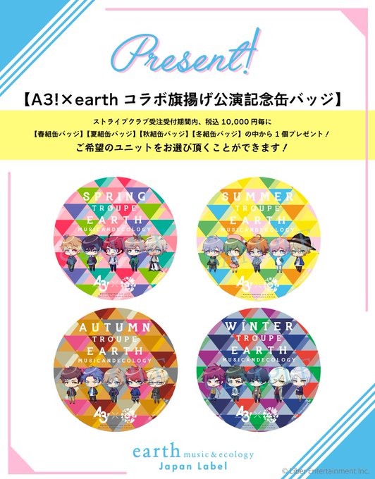 『A3!』とearth music&ecology ジャパンレーベルがコラボ😆マニッシュにもガーリーにもお使い頂けるアイテム!ノベルティはMANKAIカンパニー×earth旗揚げ公演記念缶バッジ🌟#エースリー https://t.co/DXl2NsB2EV