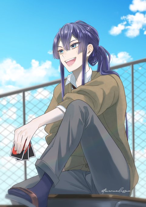 『隣のクラスの長尾景』というテーマで、いろいろあって屋上でカードゲームしてるところを友人と描きました!!