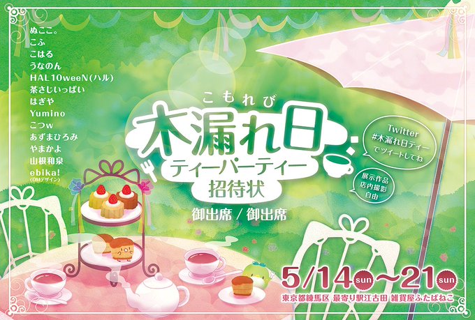 ふたばねこにて2017年5月14日〜21日開催の「木漏れ日ティーパーティー」のDMデザインさせて頂きました☕️🍰🍴🍀 #木漏れ日ティー