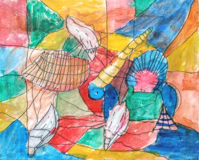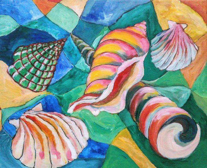 たっぷりの絵の具を粘土細工のように盛りつけ、貝の形をなぞる感じ。