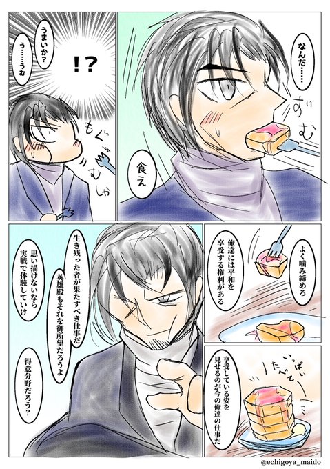 せっかくならここに繋げるか。戦後に大尉殿と守護神がパンケーキ食いながら語らってる話。食う都合上素顔妄想漫画。
