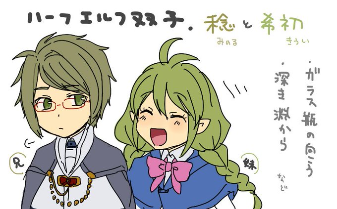 @edda_x 【稔と希初】双子の若者ハーフエルフ。裕福な家の生まれだったがハーフエルフと分かってから迫害された過去がある。その際に稔は捻くれたが、希初はお人好しのままだった。パッと見性格が正反対に見える双子だが、どちらもシスコンブラコン。希初の方が稔の性格に救われている所がある