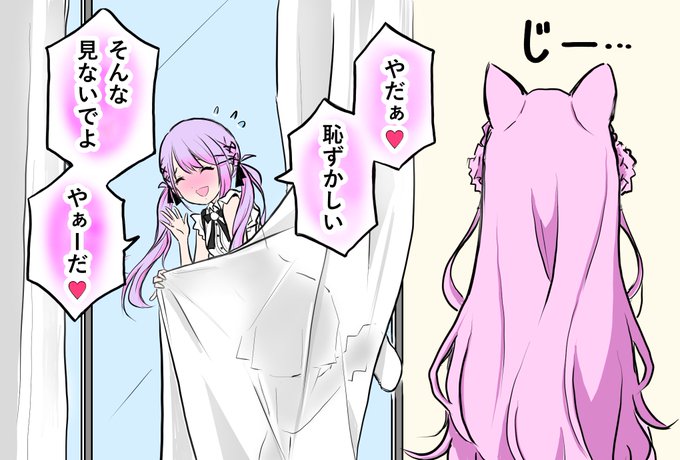 こよりにじっと見つめられ恥ずかしくなってカーテンに隠れるトワ様。 #TOWART #ホロライブ