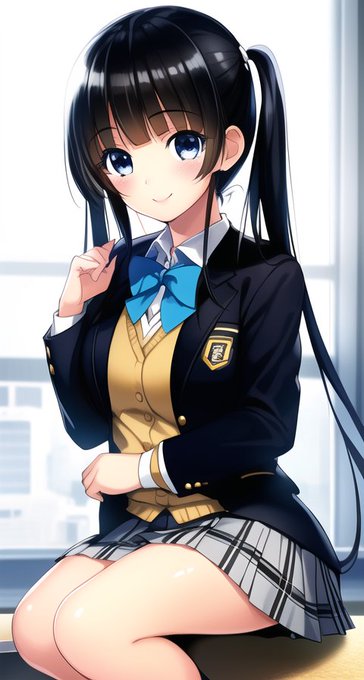 ブレザー、チェックスカート、黒髪ツインテール、