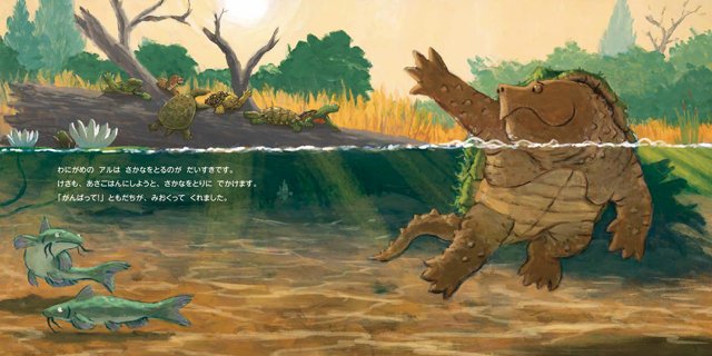 わにがめのアルが、あさごはんにしようと川の底にもぐったときのお話です。