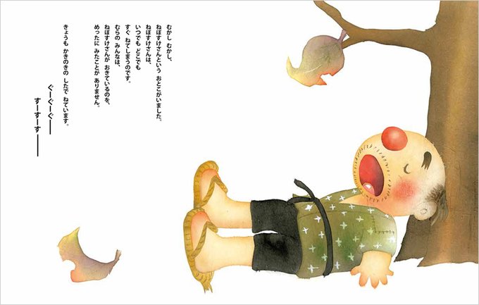 カラスが落とした柿の実が、ねぼすけさんの頭で芽を出し実をつけました。