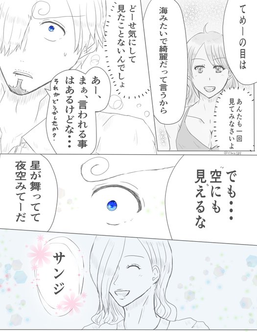 🍴の目をじっと見てる付き合ってない無自覚ゾサ。🍴の目は青色派です。⚔️がほんのう?のままに行動して、ちゅーもしているので注意してください。そしていつものようにおちなど…ないです!! ※ゾロサン (1~4ページ/全8ページ)