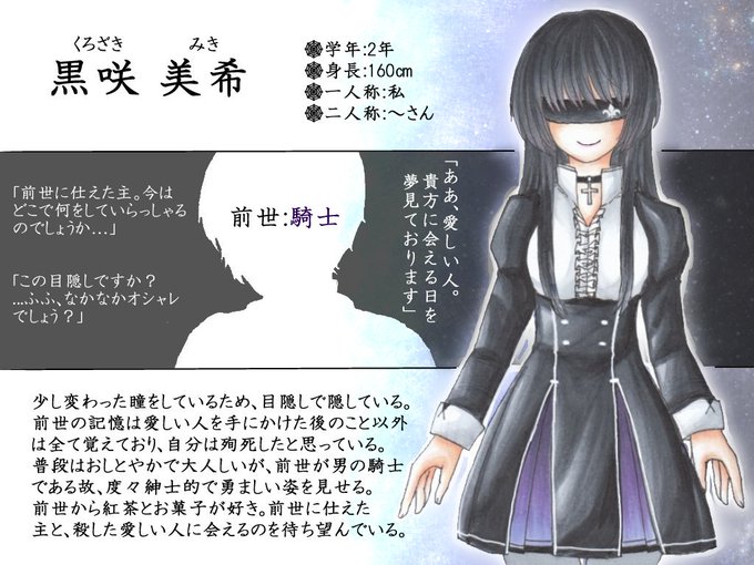 人との関わりが薄かったため喋り方が幼い。物をくれると後ろからついていく。よく食べる。 人形と洋服が好きで、彼女の洋服も自作だとか。 とある西地区の人物を殺して欲しいがため、東地区で野宿をしながら徘徊している。 #東と西の殺人街