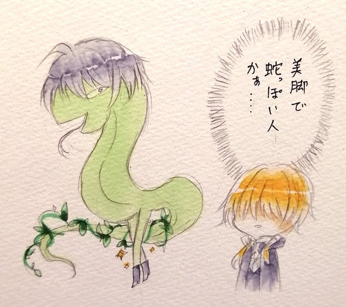 @by0ut0u 【レオンのイメージ勘違い①:蛇足さん】 ■「蛇足さんは両腕が無いんですよ。その分脚の長さや尻尾が長く見えるので綺麗ですけどね。尻尾には蔦が生えていて、いつも黄緑の御顔の笑顔がとっても素敵なんです。良い意味で蛇っぽい方ですね」 獅恩「へぇー」
