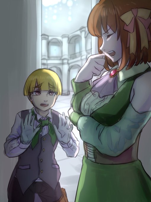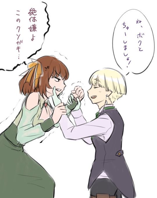 #濃藍の使用人達 元気になったアーレラはリズより元気💪 リズをナイフで脅したり、僕を撫でろ!と命令したりとやりたい放題。リズは僕のだよ!と言って全く改めない
