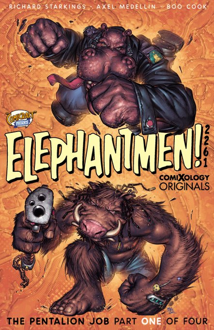 🌟🐘🤖Covers to issue one and two of @Comicraft's Elephantmen 2261: The Pentalion Job by @RichStarkings @AxelMedellin and cover art by Boo Cook! Available at @comiXology and coming soon to Print On Demand at @amazon #comics #elephantmen #robots