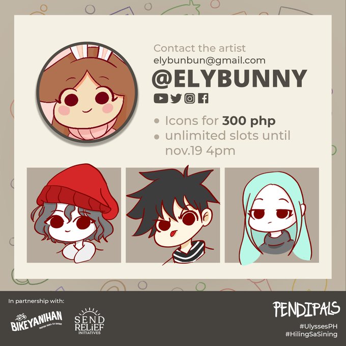 Hi I'm Ely, an artist for #HilingSaSining If you're interested at my works please fill in the form below! All proceeds will be donated to our partnered donation drives (Bikeyanihan and Send Relief Initiatives)