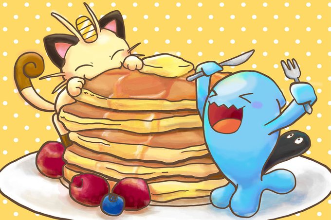 何年か前に描いた、なぜかニャースとソーナンスがでっかいホットケーキを食べてる絵 #ポケモン #イラスト