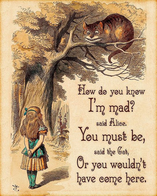 When Alice meets the Cheshire Cat she learns that madness reigns Wonderland, as he says, “I’m not all there myself.” The phrase “Cheshire cat grin” dates to 18th-cen Cheshire’s dairy farms which made for happy cats. But Lewis Carroll made them famous forever. 🐱#MythologyMonday