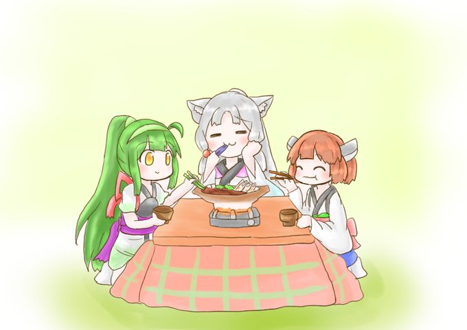お題「東北三姉妹がお祝いにきりたんぽ鍋をつついてる絵」 イタコ姉さまボイロ化おめでとう! #東北イタコ #東北ずん子 #東北きりたん