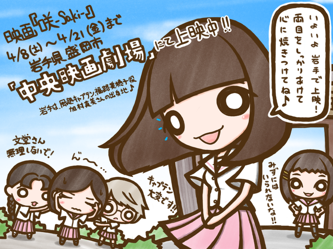 いよいよ岩手で上映開始! 4/8(土)〜4/21(金)まで岩手県盛岡市中央映画劇場にて https://t.co/oGvsIAzIoF なんと平日17時の回は1,300円で鑑賞できます 風越キャプテン福路美穂子役の加村真美さんの出身地岩手で咲をたくさん堪能しましょ〜! #咲実写