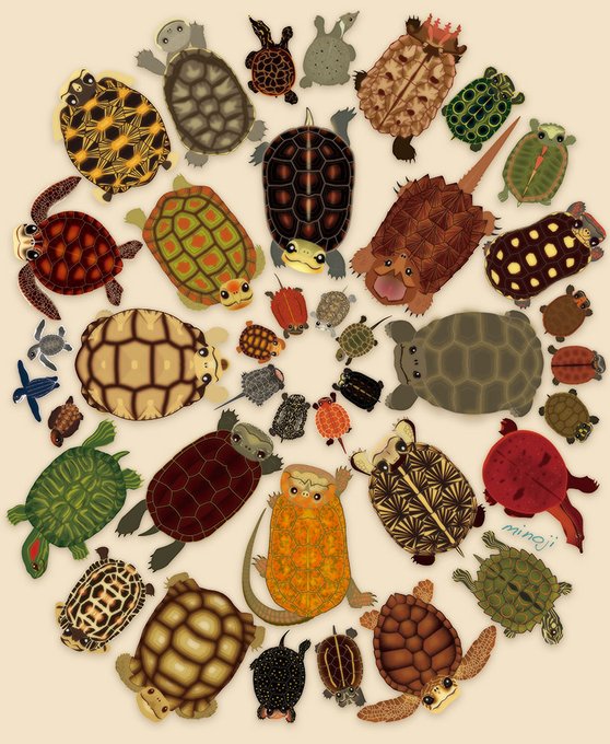 世界中のいろんなカメ、暮らす環境によって甲羅の色や形も変わって色とりどりです。