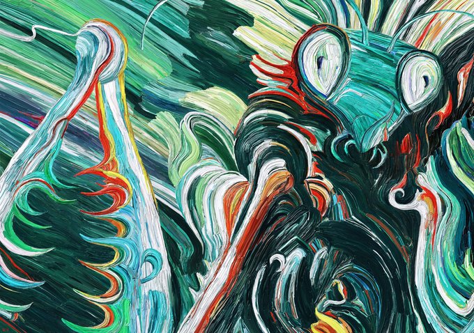 "Monster Meal" [NOT FOR HUMAN CONSUMPTION #6] is minted. You can make an offer >1ꜩ for 24 hrs. Will take highest offer. If I don't get one I will sell after 24 hrs for 1ꜩ. 3074 px square. AI + 7 hrs digital painting.