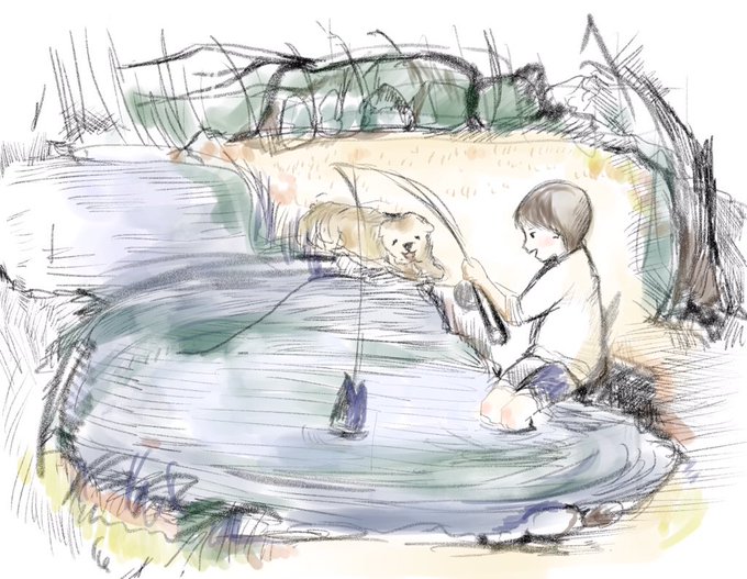 #背景版深夜の真剣お絵描き60分一本勝負 お題:釣り堀 画材 clipstudiopaint for iPad ペンは鉛筆と透明水彩ツールのみ使用。