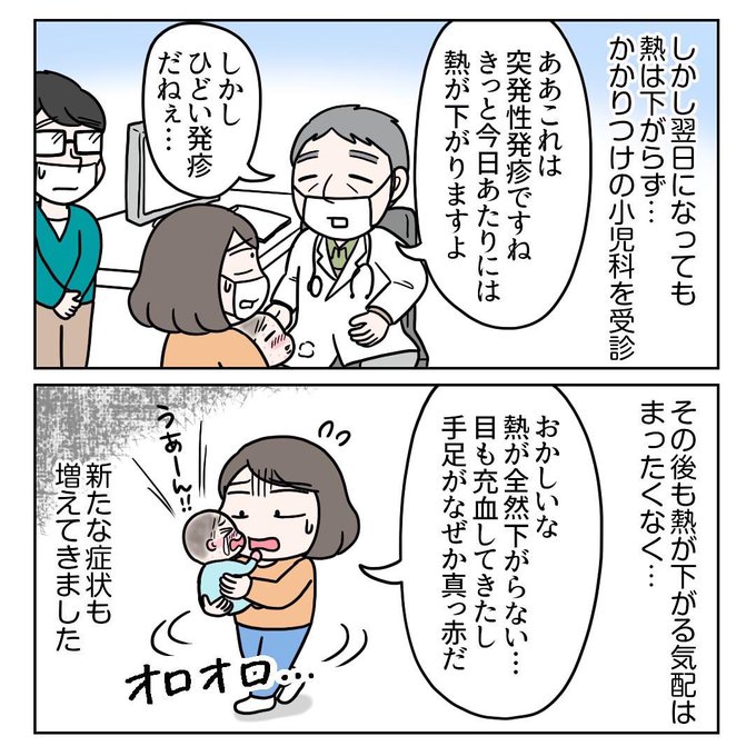 『川崎病の記録』1/3 第2話 突然の入院 . 先月息子が川崎病になり10日間入院したときの話のつづきです。4つ目の病院で発覚し、即入院となりました。 #川崎病 #コミックエッセイ