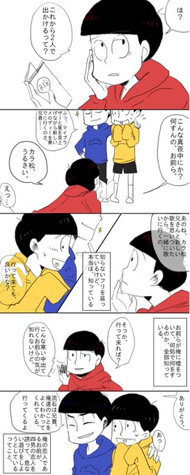 十四松関係のCPを描いてみよう自分企画その1。あみだくじの結果、十カラ。ただ私が描くので、一松→十⇔カラ。十四松はカラ松が一松のこと好きだと思っていて引き離そうとするし、カラ松は十四松が一松のこと好きだと思っている。イッチ可哀想。