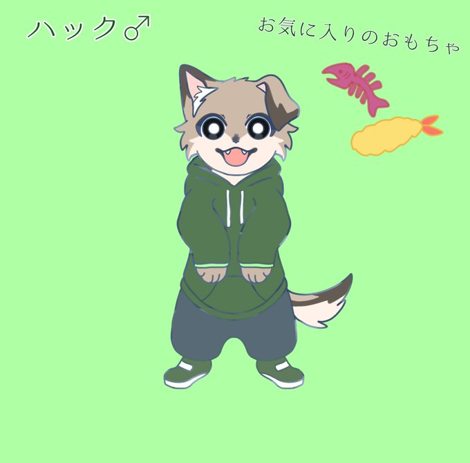 新しいオリキャラ~ うちの飼い犬の『ハック』名前もそのまま デザイン変えてるけどカラーはそのままにした! エビフライとシャケの骨のおもちゃがお気に入り☺️