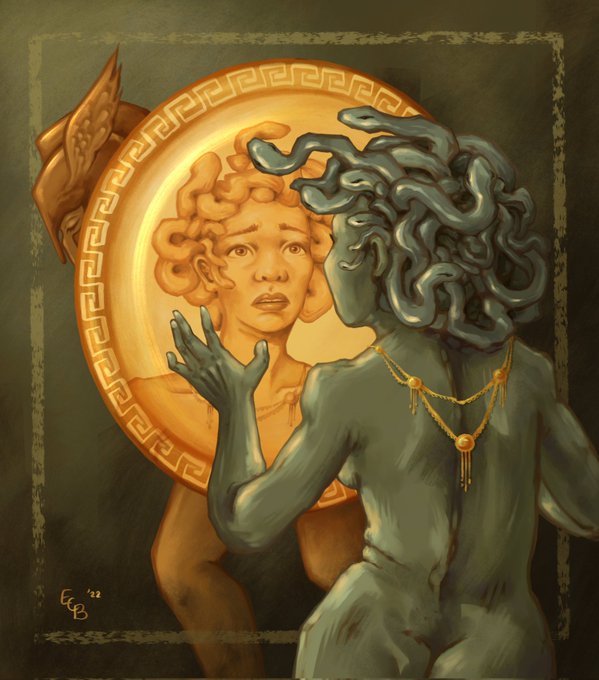 I wanted to show Medusa here horrified and fascinated by both herself and her fate, with Perseus as a background character, in an almost submissive pose holding the shield for her to truly see herself, rather than as the conquering hero.