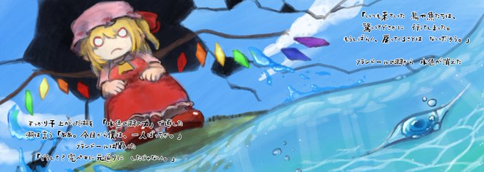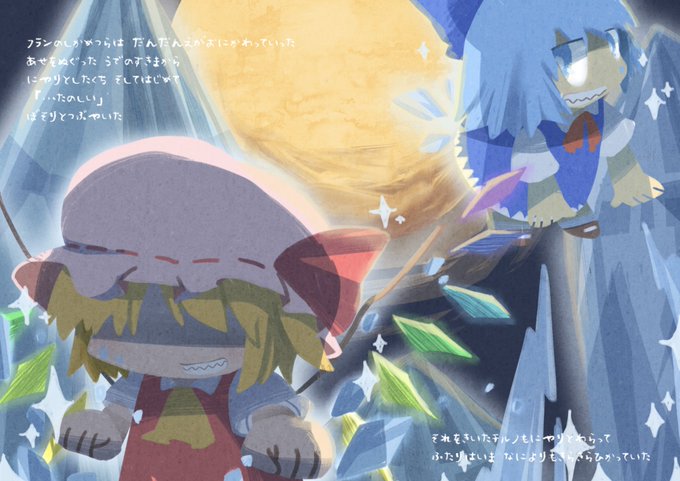 世界中壊してまわったフラン。「壊すことしかできないかわいそうな妹」と哀れむレミリア。フランは「私はなんだってできる」と、一度壊した世界を、七色の羽の力で直して回ります。リプに続きあります