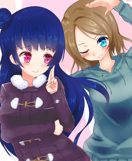 曜ちゃんとのツーショットで戸惑って普通のチョキを出してしまう善子を描きたかった(*゚∀゚*) #ラブライブサンシャイン #津島善子 #渡辺曜 #ラブライブ