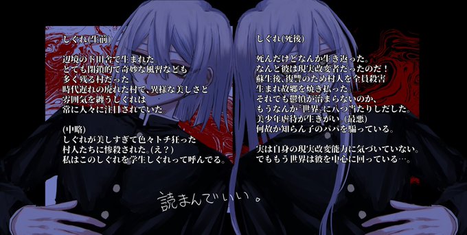 @karetyauknife カクカクとしてしっかりした線が超大好きです!!!骨張った感じもとても好みで最高です…!!青とか白っぽい色でまとめた絵がとても好きです…!枯宮ナイフさんの絵柄では是非ザイア(右の奴)を見てみたいな〜!と思います!!