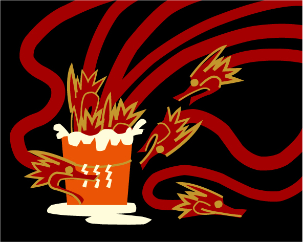 →高天原を放逐されて放浪するスサノオは斐伊川の上流で一本の箸を見つける。川上を尋ねると娘を挟んで泣く老夫婦。理由を聞けばヤマタノオロチが娘を食べに来るという。酒を作り、大蛇を酔わせ、退治すると尻尾からすばらしい剣が現れた。→