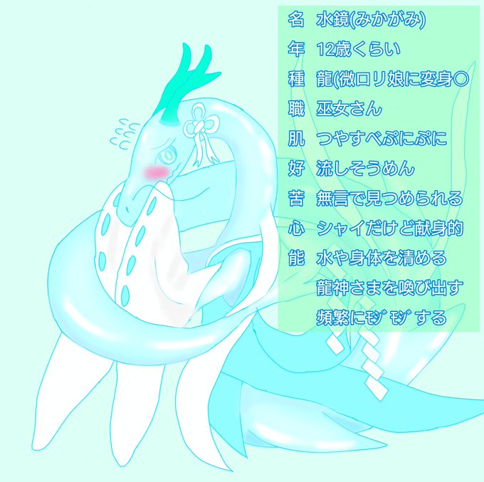 もじもじ巫女さん東洋龍、みっちゃん。各地を巡って水源地を清めて回るのが役目らしい。