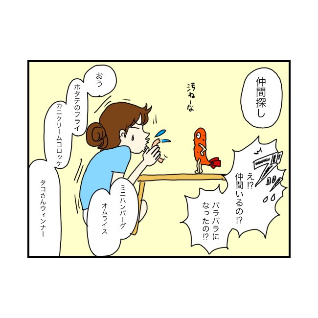 今日は2コマ目のえびフライが妙にデカくて角ばっているのをよく見てみましょう。