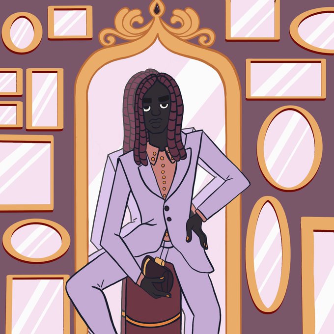 @queerwebcomic I’m moses, a black trans masc artists and i sell my art on merch like bags and notebooks and stuff