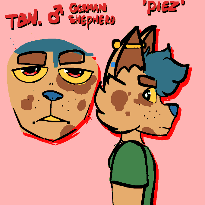 Hi, welcome, my name is Piez! I draw and animate. You can just call me Pie too if you'd like! This is my sona, a punk german shepherd dog partially based on the design of Odie from Garfield!