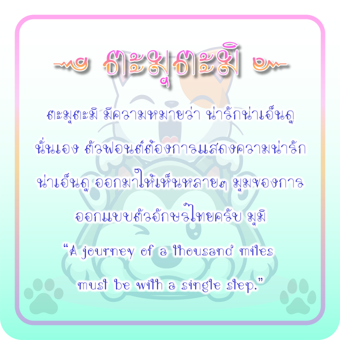ผลงานฟอนต์ที่ตัว 6ตะมุตะมิ มีความหมายว่า น่ารักน่าเอ็นดูนั่นเองตัวฟอนต์ต้องการแสดงความน่ารัก น่าเอ็นดูออกมาให้เห็นหลายๆ มุมของการออกแบบตัวอักษรไทยครับ มุมิ