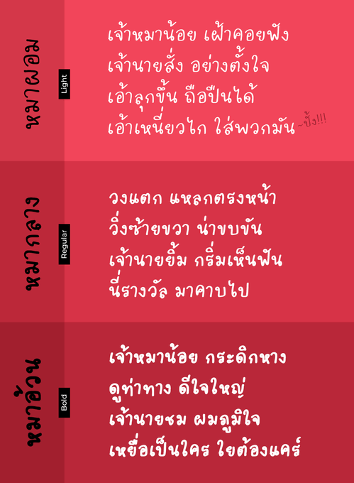 ฟอนต์ลายมือที่เป็นมิตร อ่านง่าย (ปกติผมเขียนชุ่ยกว่านี้เยอะ 5555555) หยิบไปใส่งานออกแบบอะไรแล้วก็ดูลงตัว ใช้ง่ายและหลากหลาย เหมือนเจ้าหมาเพื่อนรักที่แลบลิ้นกระดิกหางวิ่งหูตั้งมาเสนอหน้าตลอดๆ