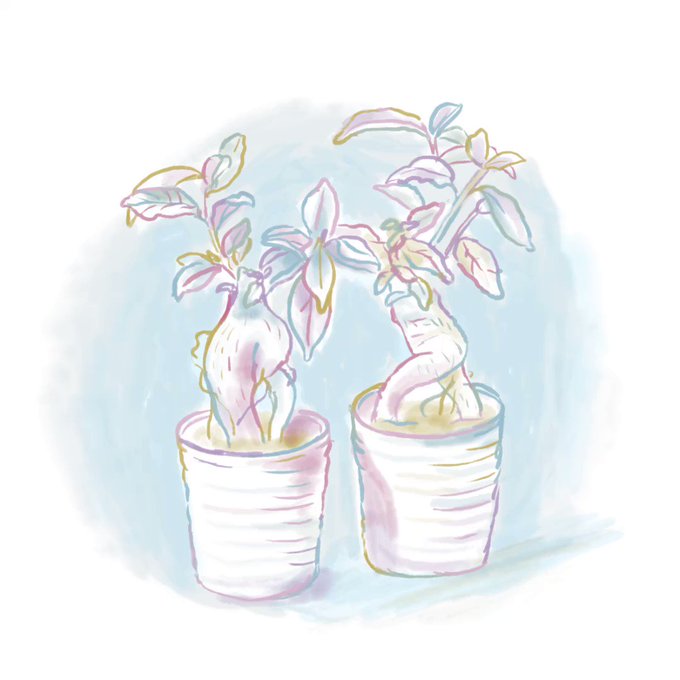 我が家の、前に進もうとするガジュマルと、セクシーな曲線美のガジュマルが仲良く幸せそうに日に当たっていたところを描きました。
