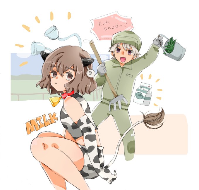 神童印の牛乳。井吹が見習い飼育員で、神童さんが新種の乳牛。