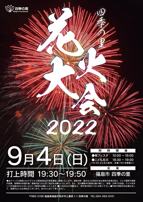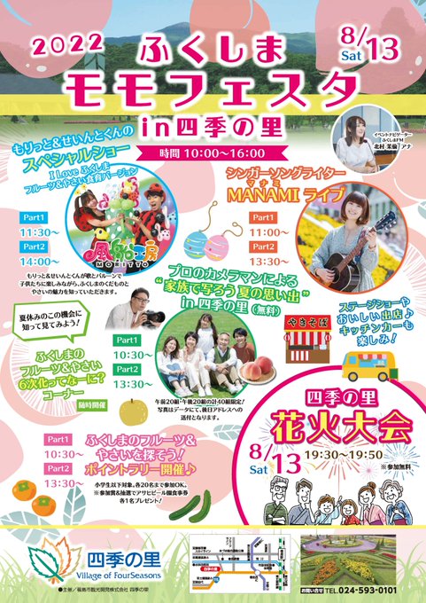 本日はふくしまモモフェスタ&四季の里花火大会です!楽しいライブ・ショーはもちろん、19:30からの花火大会は3年ぶりの開催!1日中お楽しみ頂けますよ~🤗