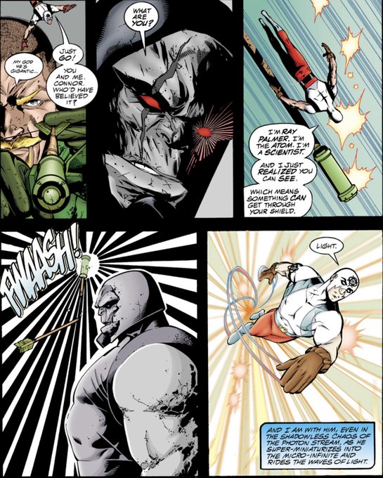 Essa página me arrepia toda vez que leio. Arqueiro Verde e Átomo descobrem como matar Darkseid. Grant Morrison e Howard Poter, JLA 14.